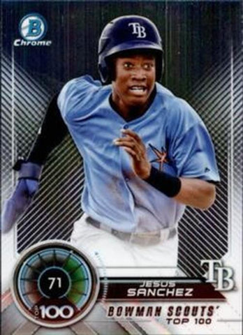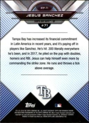 This is a nice example of a 2018 Bowman #BTP-71 Jesus Sanchez Bowman Chrome Scouts' Top 100.