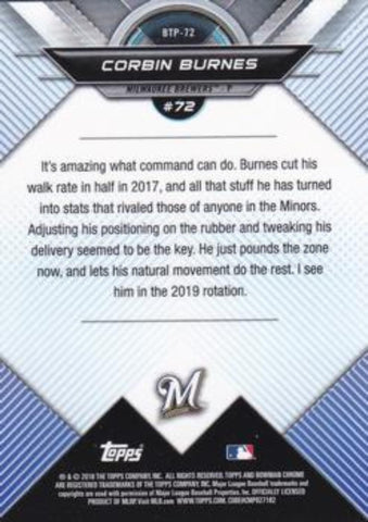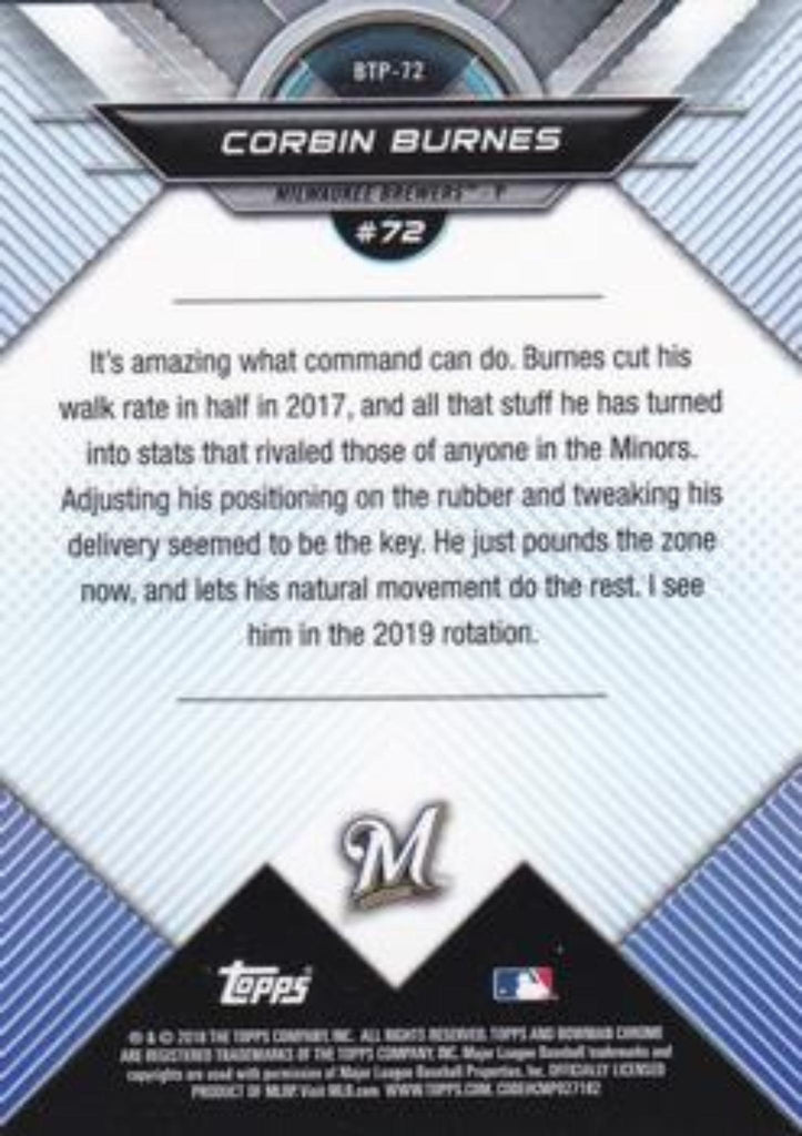 This is a nice example of a 2018 Bowman #BTP-72 Corbin Burnes Bowman Chrome Scouts' Top 100.