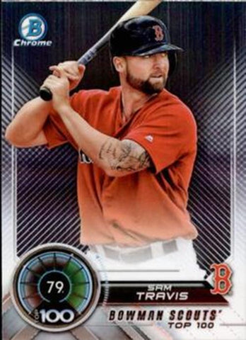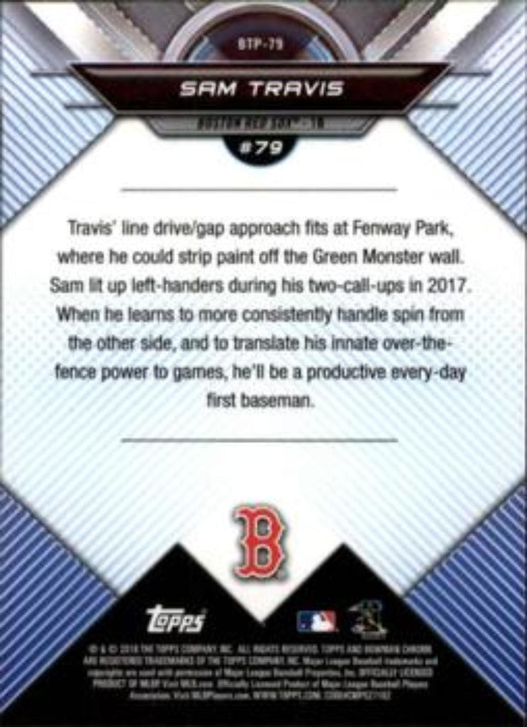 This is a nice example of a 2018 Bowman #BTP-79 Sam Travis Bowman Chrome Scouts' Top 100.