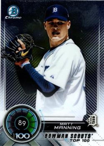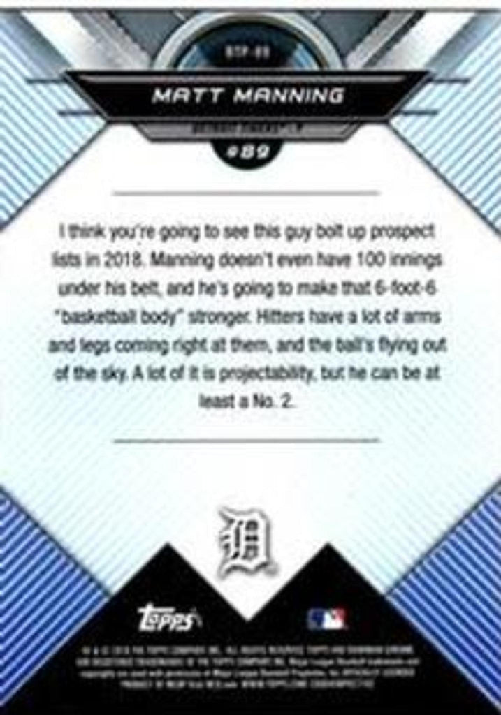 This is a nice example of a 2018 Bowman #BTP-89 Matt Manning Bowman Chrome Scouts' Top 100.