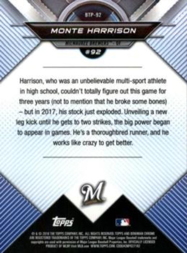 This is a nice example of a 2018 Bowman #BTP-92 Monte Harrison Bowman Chrome Scouts' Top 100.