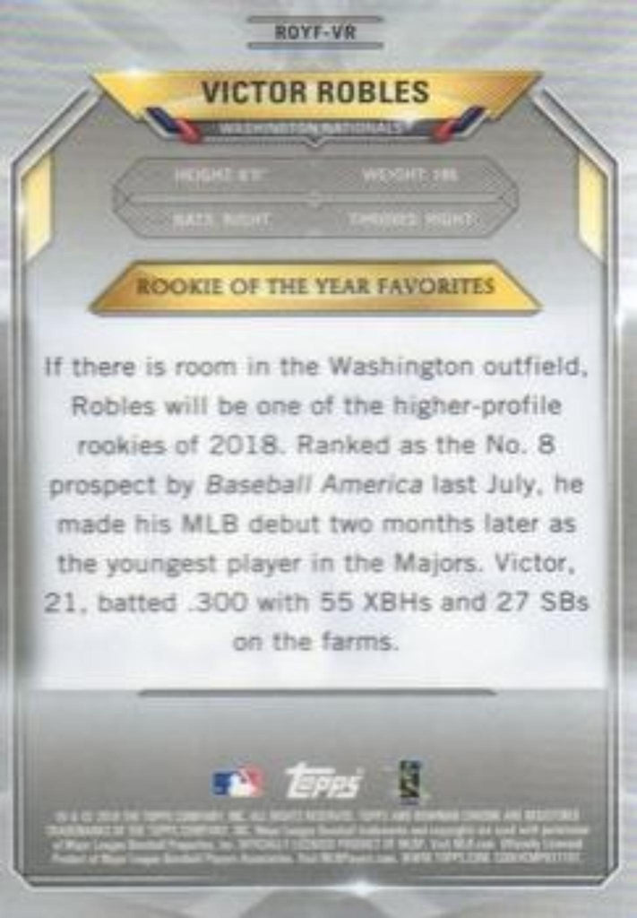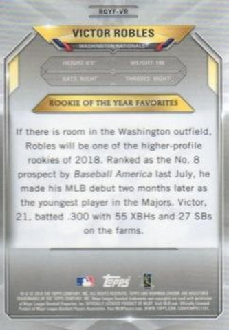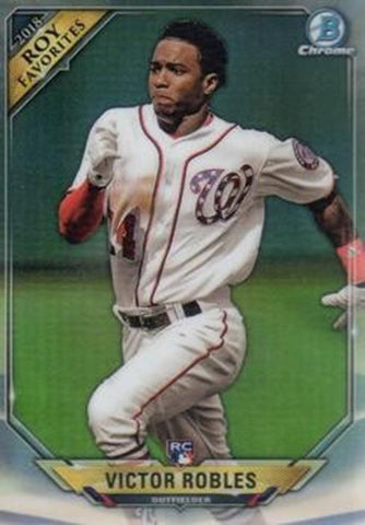 This is a nice example of a 2018 Bowman #ROYF-VR Victor Robles Chrome Rookie of the Year Favorites.