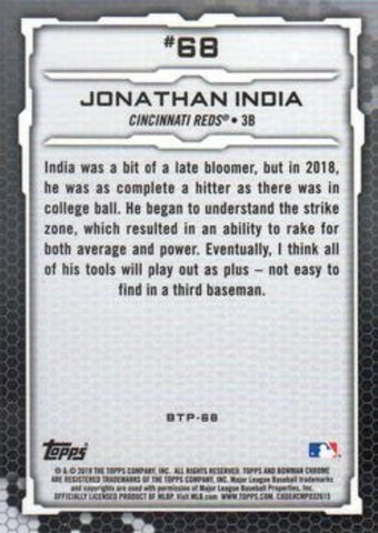 This is a nice example of a 2019 Bowman #BTP-68 Jonathan India Bowman Scouts' Top 100.
