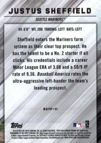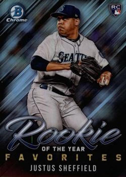 This is a nice example of a 2019 Bowman #ROYF-11 Justus Sheffield Rookie of the Year Favorites.