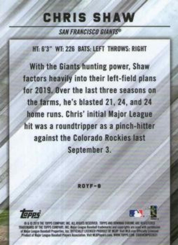 This is a nice example of a 2019 Bowman #ROYF-8 Chris Shaw Rookie of the Year Favorites.
