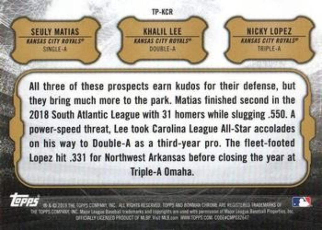 This is a nice example of a 2019 Bowman #TP-KCR Seuly Matias / Khalil Lee / Nicky Lopez Talent Pipeline.