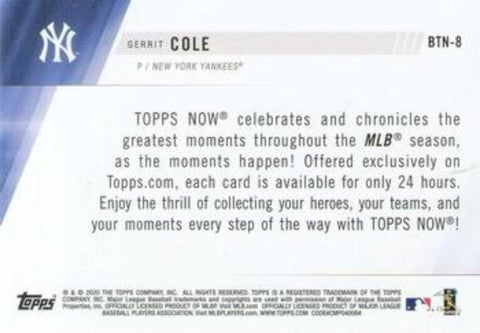 This is a nice example of a 2020 Topps #BTN-8 Gerrit Cole Best of Topps Now.