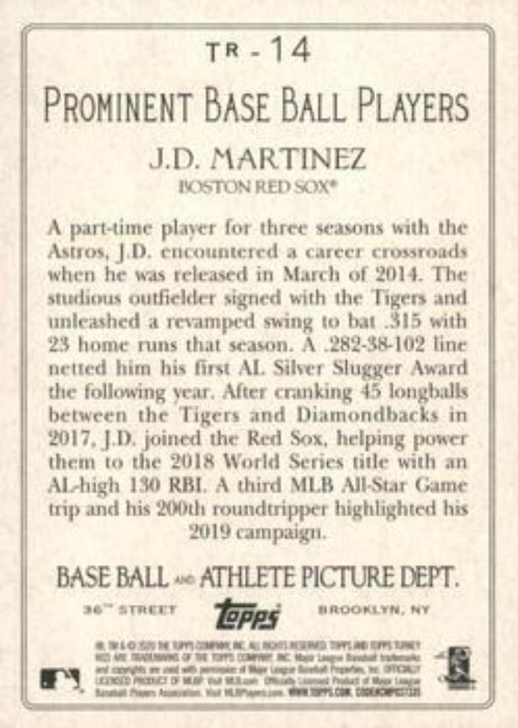 This is a nice example of a 2020 Topps #TR-14 J.D. Martinez Turkey Red 2020 (Series 1).