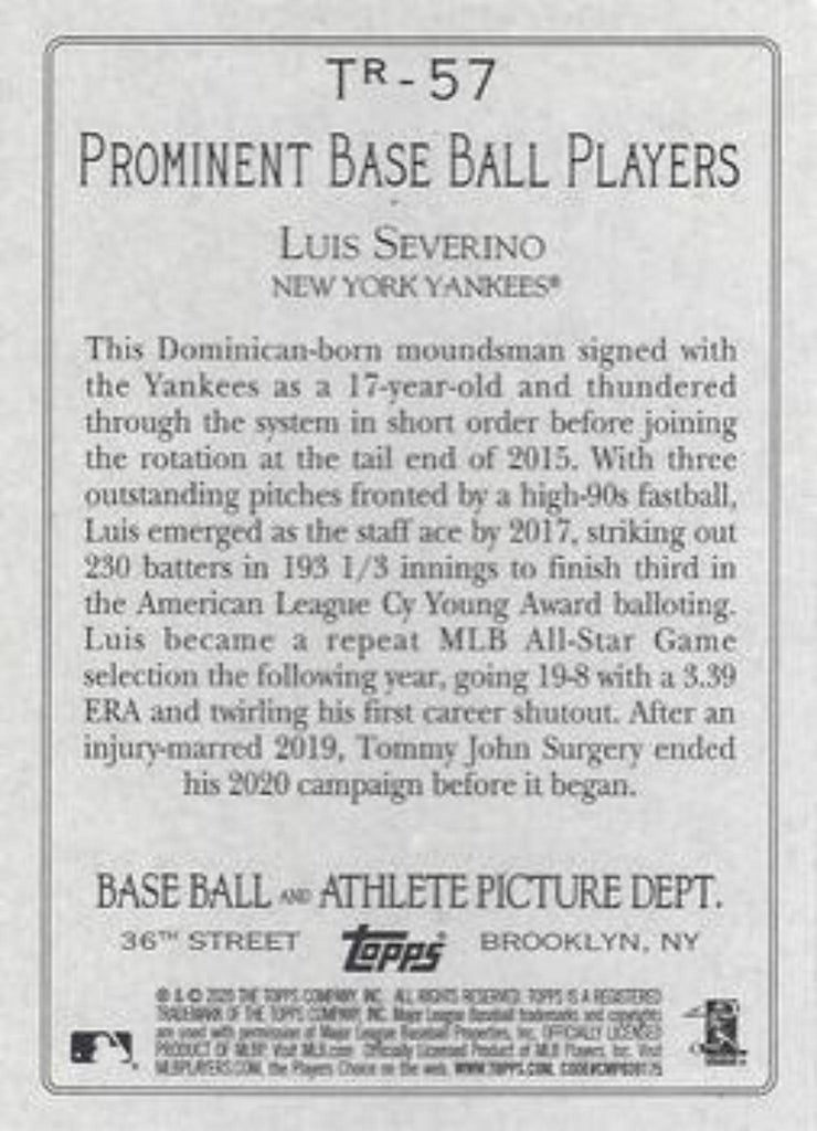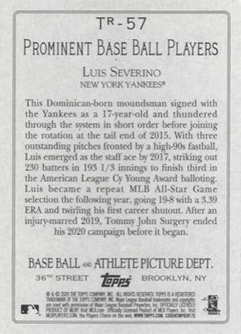 This is a nice example of a 2020 Topps #TR-57 Luis Severino Turkey Red 2020 (Series 2).