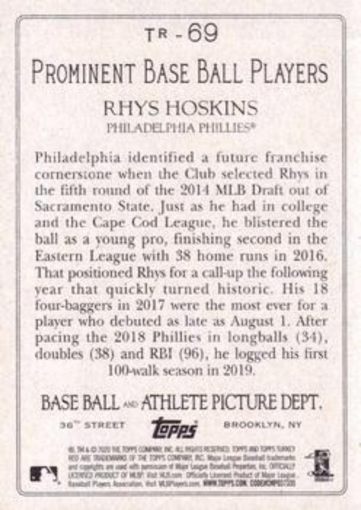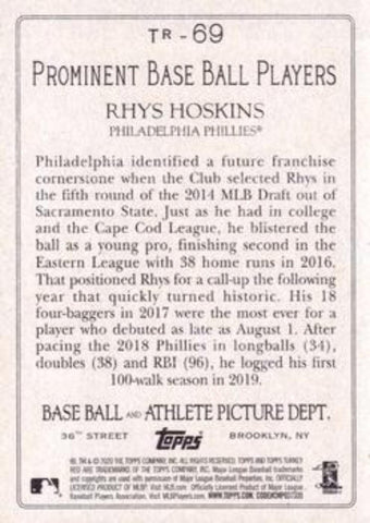 This is a nice example of a 2020 Topps #TR-69 Rhys Hoskins Turkey Red 2020 (Series 1).