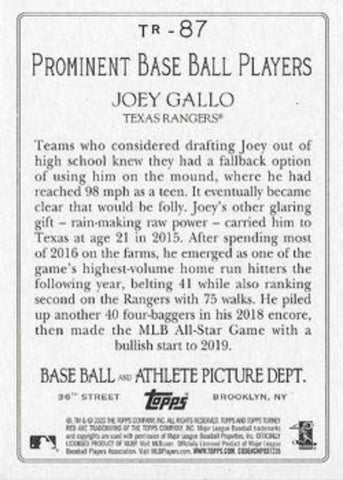 This is a nice example of a 2020 Topps #TR-87 Joey Gallo Turkey Red 2020 (Series 1).