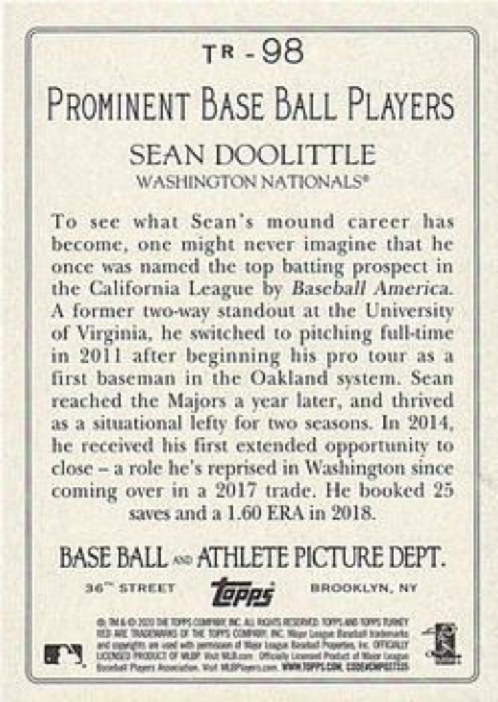 This is a nice example of a 2020 Topps #TR-98 Sean Doolittle Turkey Red 2020 (Series 1).