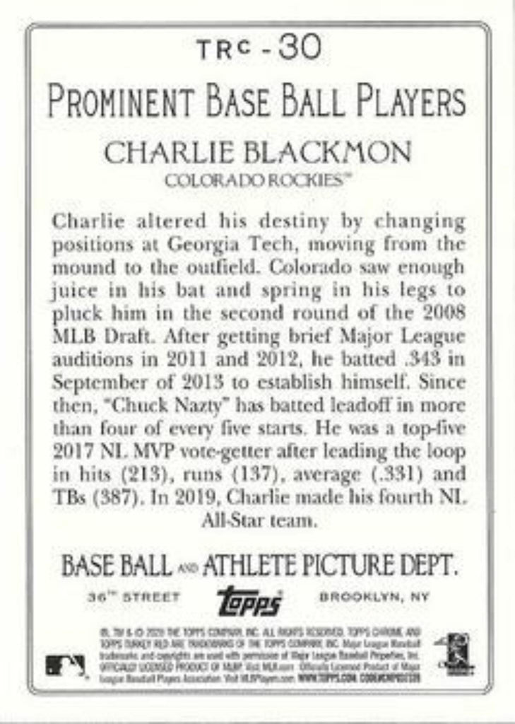 This is a nice example of a 2020 Topps #TRC-30 Charlie Blackmon Turkey Red 2020 Chrome (Series 1).