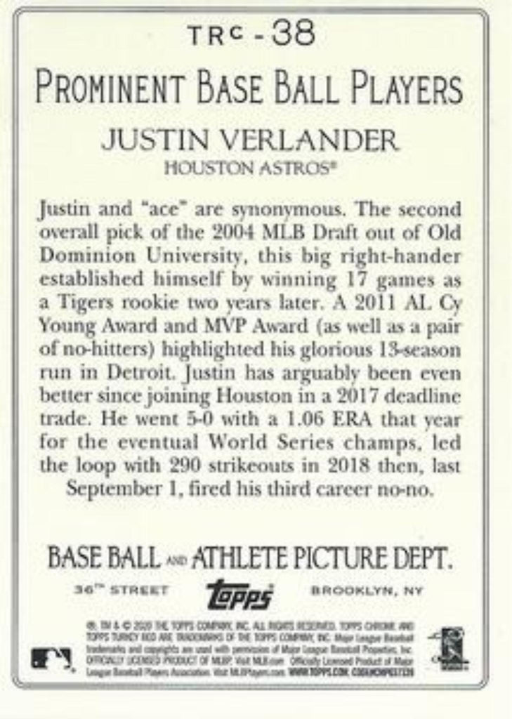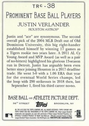 This is a nice example of a 2020 Topps #TRC-38 Justin Verlander Turkey Red 2020 Chrome (Series 1).
