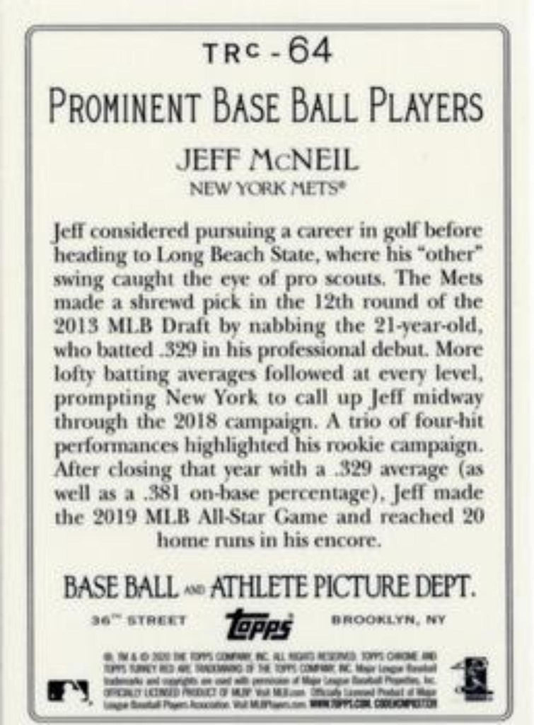 This is a nice example of a 2020 Topps #TRC-64 Jeff McNeil Turkey Red 2020 Chrome (Series 1).