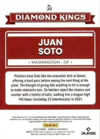This is a nice example of a 2022 Donruss #20 Juan Soto .