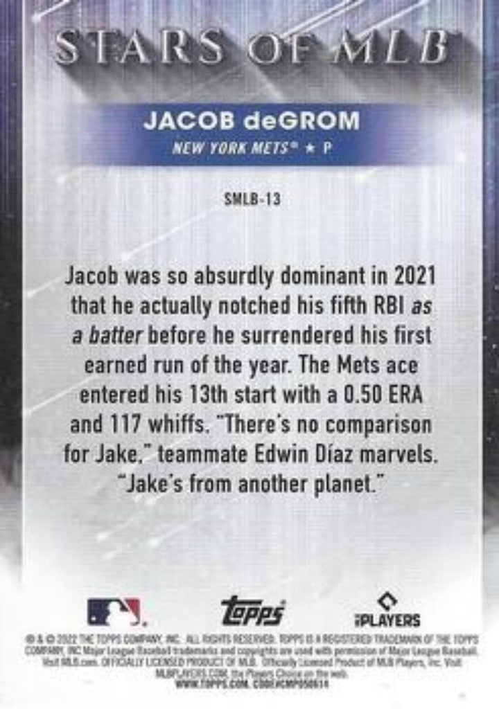 This is a nice example of a 2022 Topps #SMLB-13 Jacob deGrom Stars of MLB.