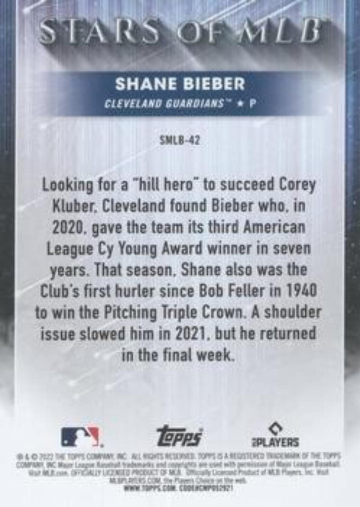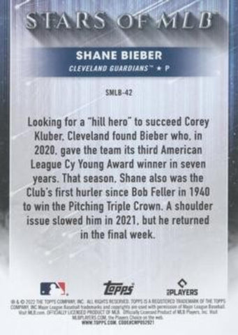 This is a nice example of a 2022 Topps #SMLB-42 Shane Bieber Stars of MLB.
