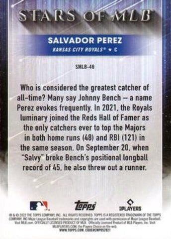 This is a nice example of a 2022 Topps #SMLB-46 Salvador Perez Stars of MLB.