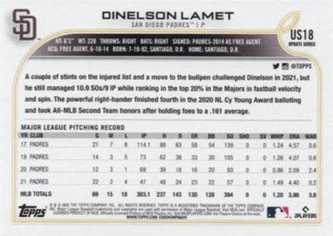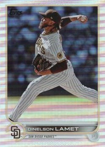 This is a nice example of a 2022 Topps Update #US18 Dinelson Lamet Rainbow Foil.