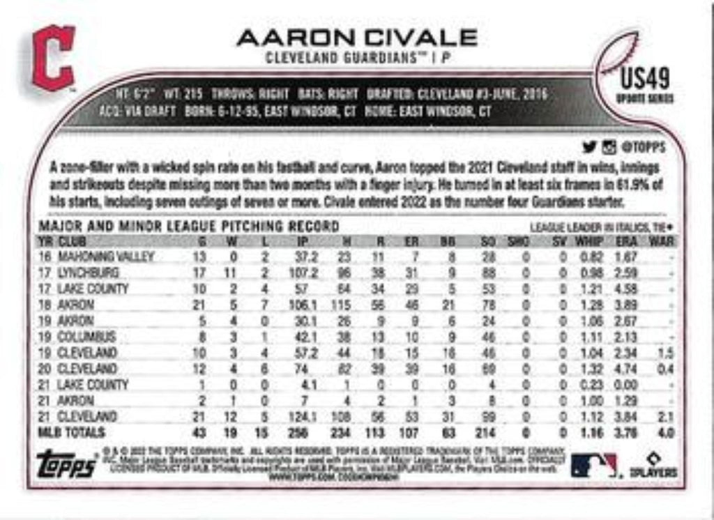 In 2022 Aaron Civale played for the Cleveland Guardians.