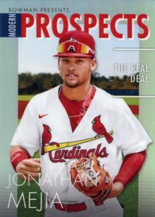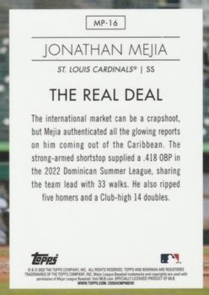 This is a nice example of a 2023 Bowman #MP-16 Jonathan Mejia Modern Prospects.