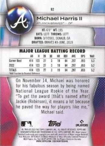 This is a nice example of a 2023 Bowman Platinum #92 Michael Harris II .