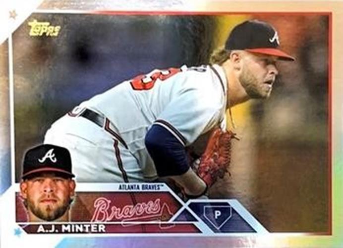 This is a nice example of a 2023 Topps #159 A.J. Minter Rainbow Foil.