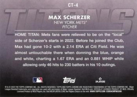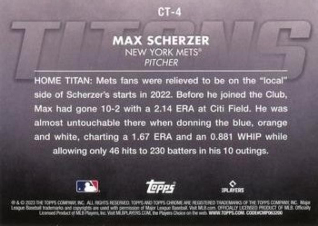 This is a nice example of a 2023 Topps Chrome #CT-4 Max Scherzer Titans.
