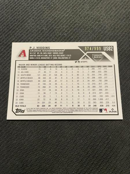 This is a nice example of a 2023 Topps Update #US82 P.J. Higgins Blue Foil.