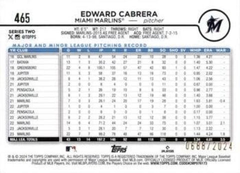 This is a nice example of a 2024 Topps #465 Edward Cabrera Gold.