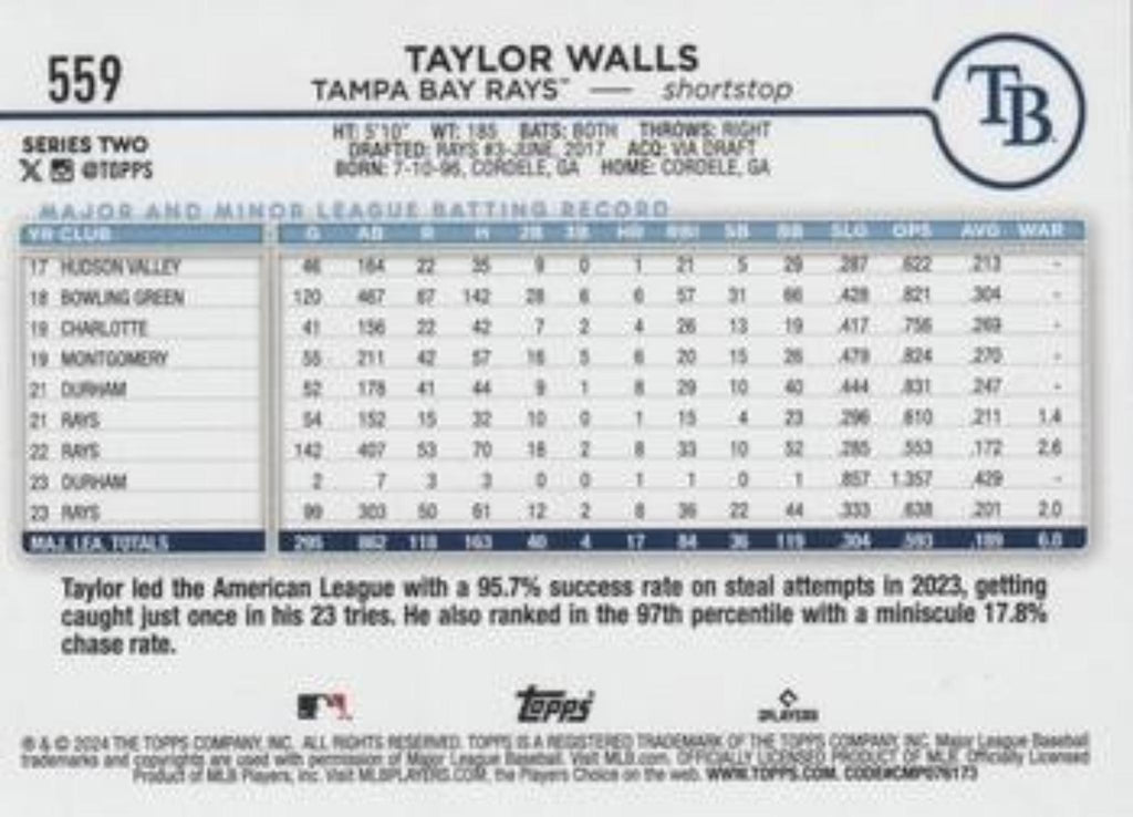 In 2024 Taylor Walls played for the Tampa Bay Rays.
