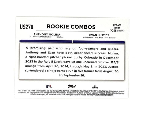 This is a nice example of a 2024 Topps Update #US270 Evan Justice / Anthony Molina RCOM Rainbow Foil.
