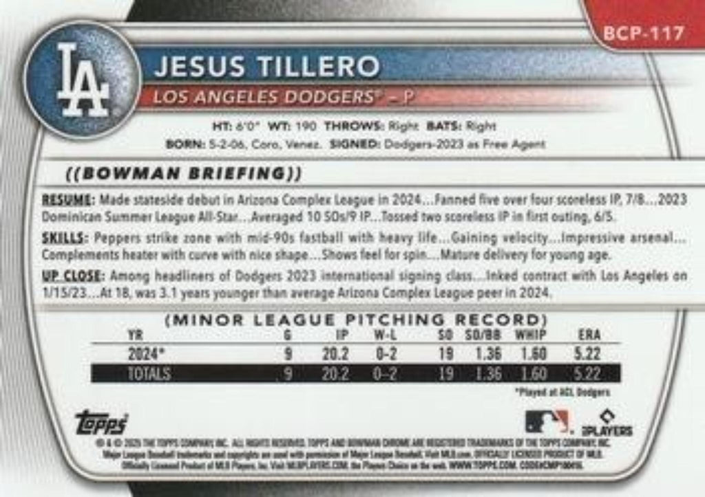 This is a nice example of a 2025 Bowman #BCP-117 Jesus Tillero Chrome Prospects.
