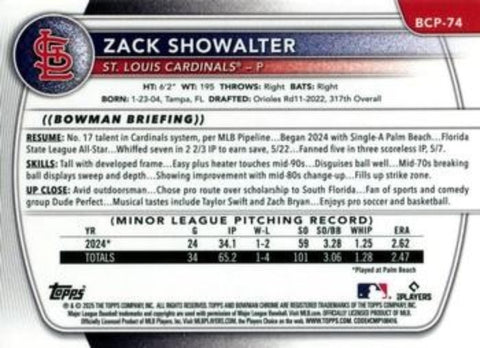 This is a nice example of a 2025 Bowman #BCP-74 Zack Showalter Chrome Prospects.