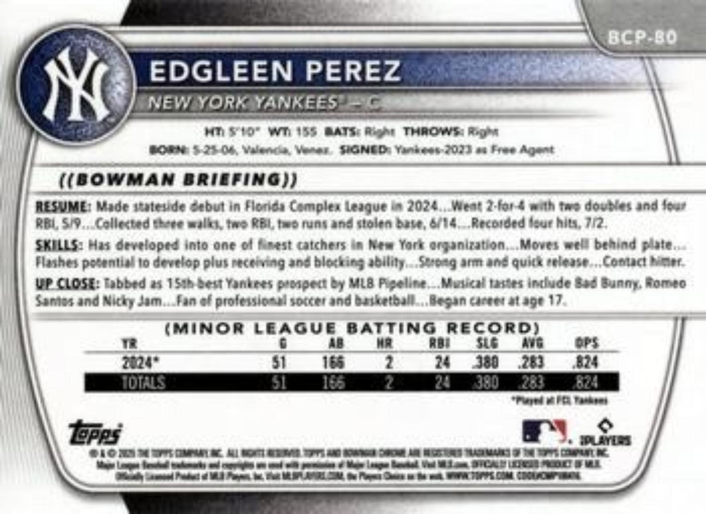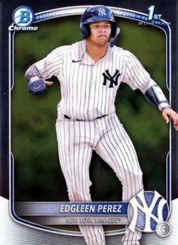 This is a nice example of a 2025 Bowman #BCP-80 Edgleen Perez Chrome Prospects.