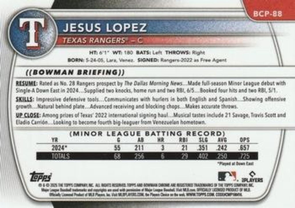 This is a nice example of a 2025 Bowman #BCP-88 Jesus Lopez Chrome Prospects.