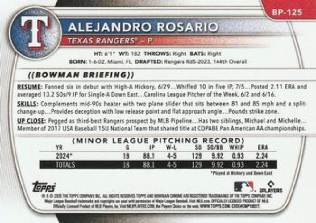 This is a nice example of a 2025 Bowman #BP-125 Alejandro Rosario Prospects.