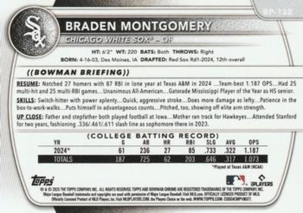 This is a nice example of a 2025 Bowman #BP-132 Braden Montgomery Prospects.