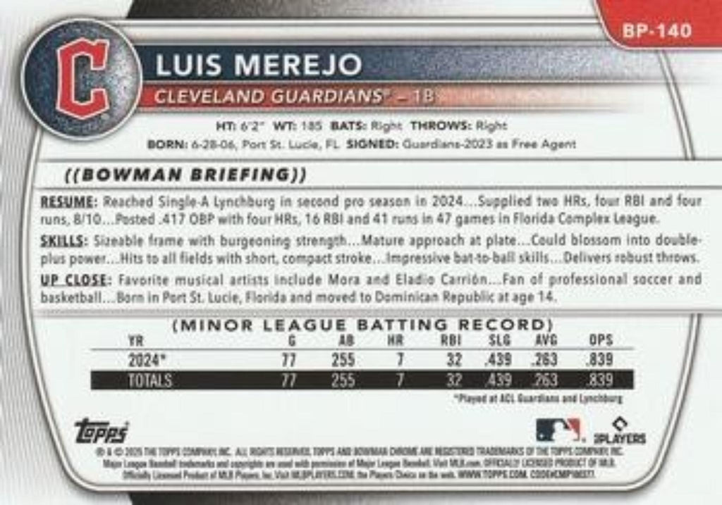 This is a nice example of a 2025 Bowman #BP-140 Luis Merejo Prospects.