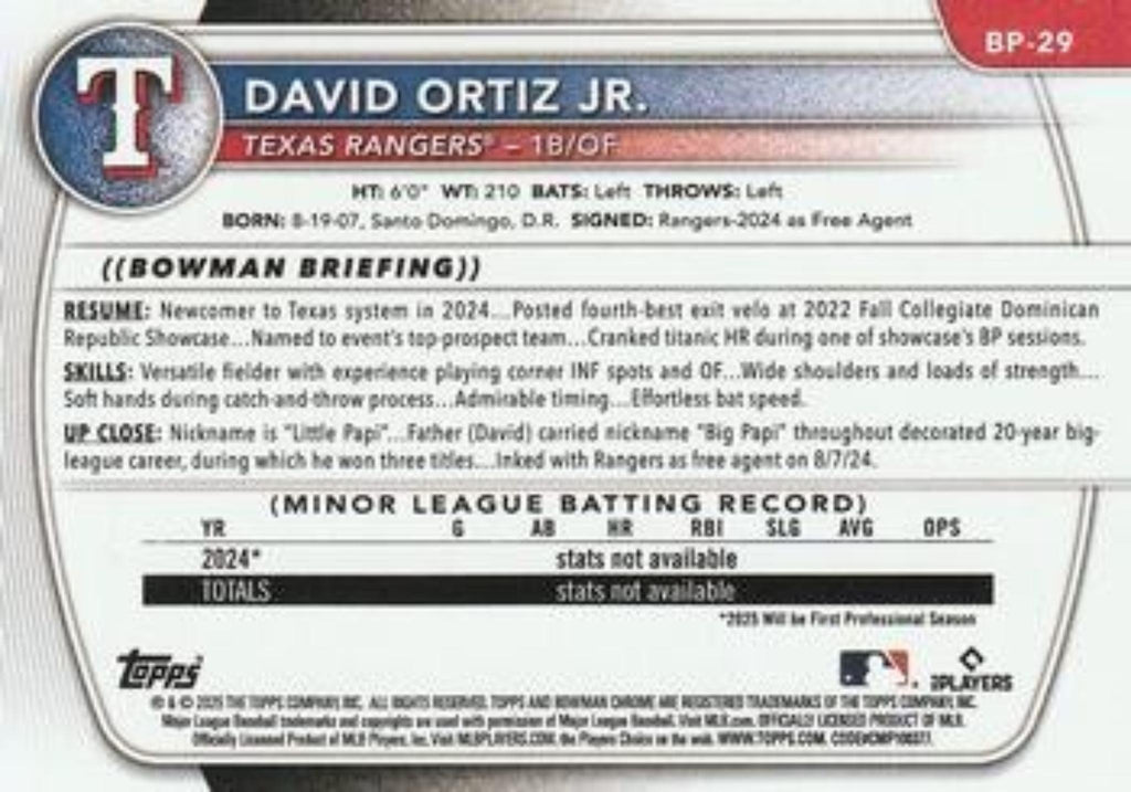 This is a nice example of a 2025 Bowman #BP-29 David Ortiz Jr. Prospects.