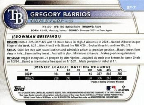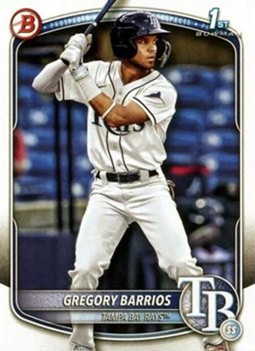 This is a nice example of a 2025 Bowman #BP-7 Gregory Barrios Prospects.