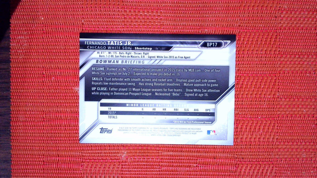 This is a nice example of a 2016 Bowman #BP17 Fernando Tatis Jr. Prospects.