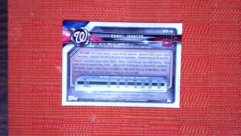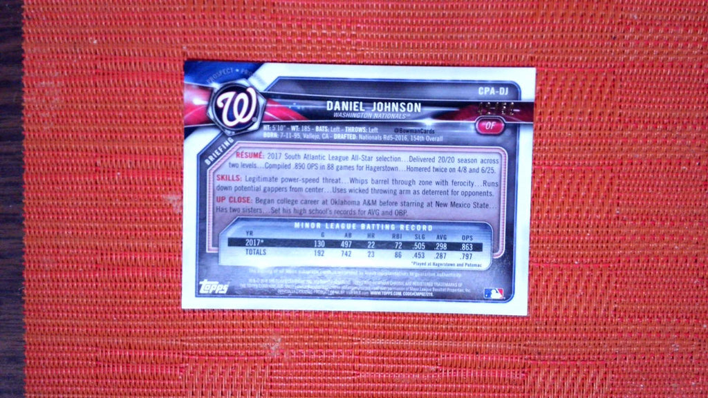 This is a nice example of a 2018 Bowman #CPA-DJ Daniel Johnson Chrome Prospect Autographs Gold.