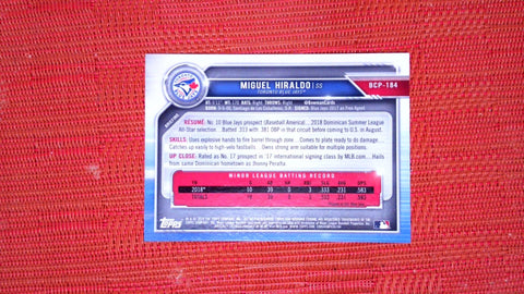 This is a nice example of a 2019 Bowman Chrome #BCP-184 Miguel Hiraldo Prospects Blue Refractor.