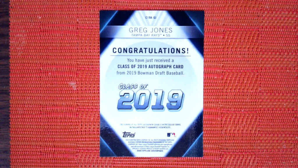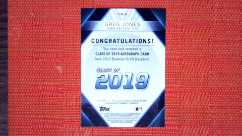 This is a nice example of a 2019 Bowman Draft #C19A-GJ Greg Jones Class of 2019 Autographs.