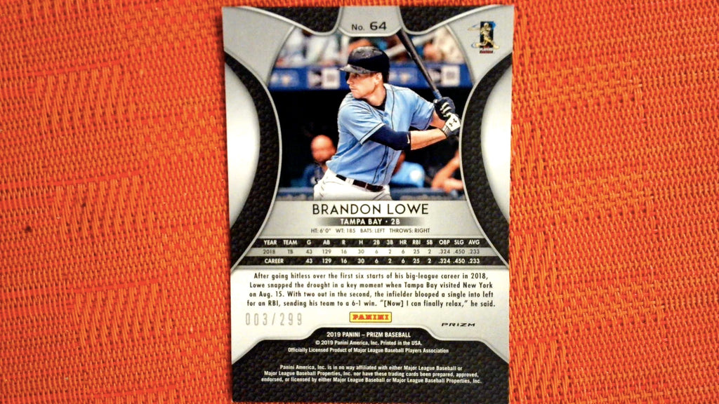 This is a nice example of a 2019 Panini Prizm #64 Brandon Lowe Red Mojo.