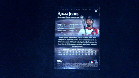 This is a nice example of a 2019 Stadium Club #94 Adam Jones Red Foil.