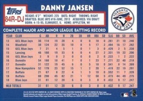 This is a nice example of a 2019 Topps #84R-DJ Danny Jansen 1984 Topps Baseball 35th Anniversary Rookies.