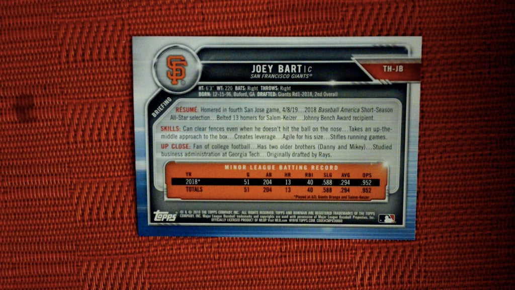This is a nice example of a 2019 Topps Bowman Holiday #TH-JB Joey Bart .